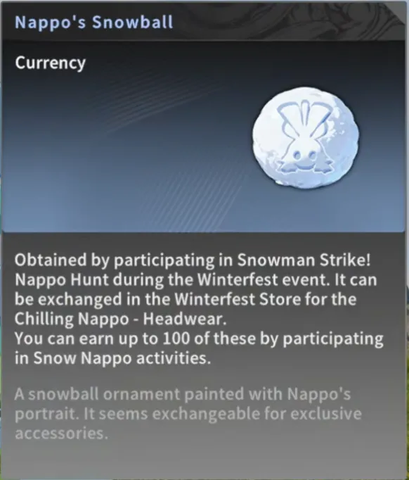 This is a special mode requiring close player cooperation. "Mischievous Snow Nappos" will appear in the plains, spawning every 10 minutes. The key to defeating them is that players must transform into a snowman to deal effective damage (Snow Nappos are immune to adventurers' skills). Once entering combat, Snow Nappos will gradually melt over time; keep up the fight to claim victory and earn "Nappo's Snowball." This item can be exchanged in the Winterfest Store for the exclusive "Chilling Nappo Headwear."