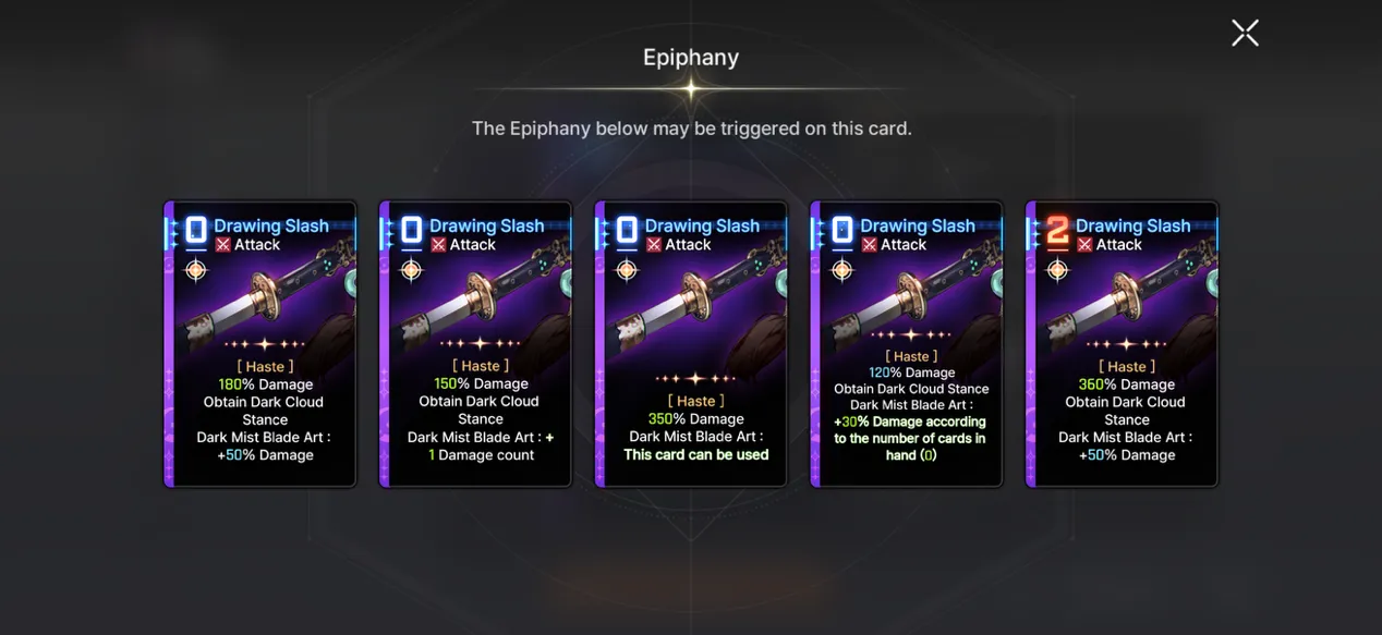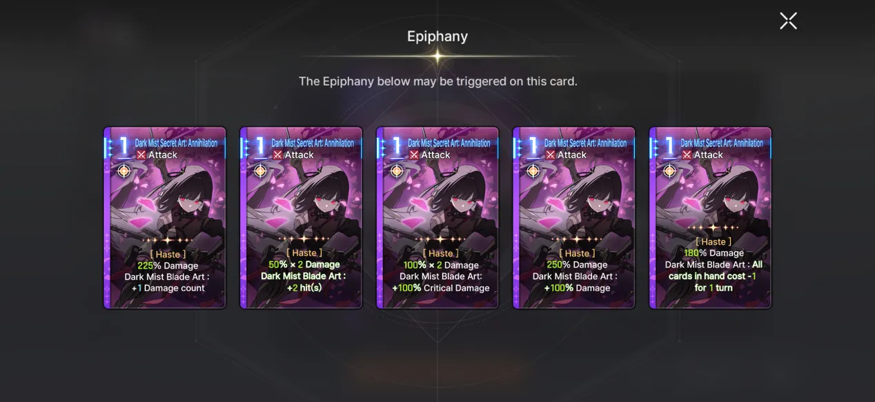 - Dark Mist Secret Art: Annihilation (1-Cost Attack): Haste attribute, 150% damage. Prioritize Epiphany effects that increase hit count or reduce hand cost.