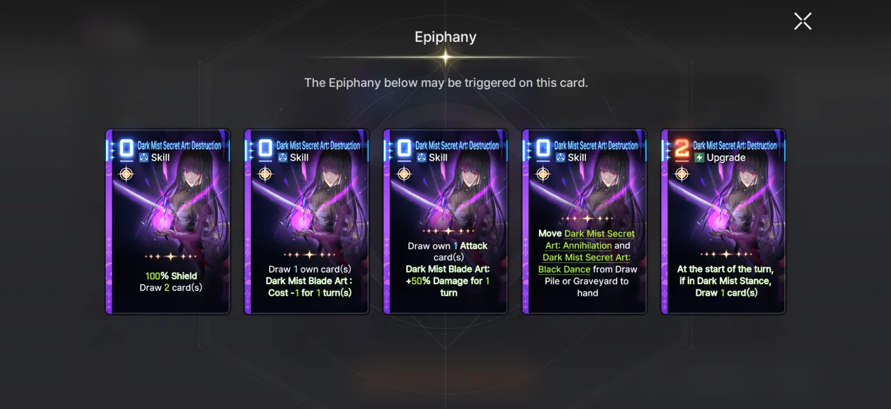 - Dark Mist Secret Art: Destruction (0-Cost Skill): Draws cards and gains Dark Mist Stance. Prioritize Epiphany effects that retrieve key cards.