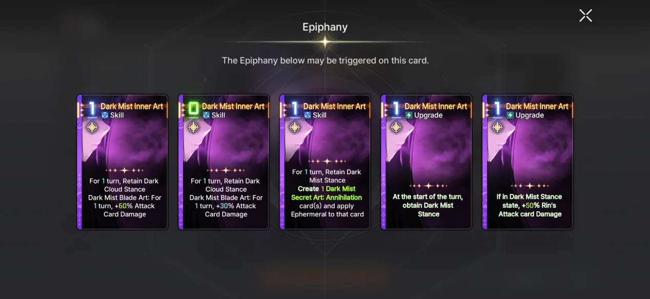 - Dark Mist Inner Art (1-Cost Skill): Retains Dark Mist Stance. Prioritize Epiphany effects that enhance Attack card damage.