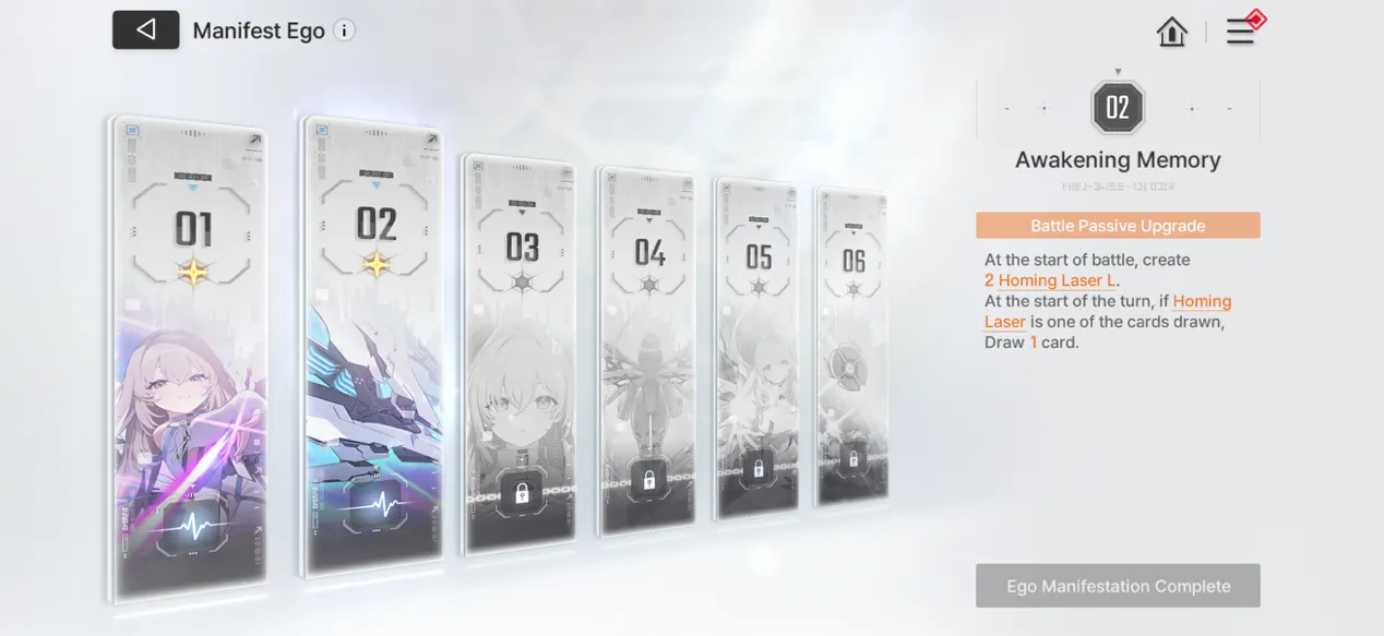 - E2 is her biggest power spike. "Awakening Memory" creates 2 Homing Laser L at the start of battle and lets you draw an extra card when you draw a Homing Laser, solving all deck consistency issues.
