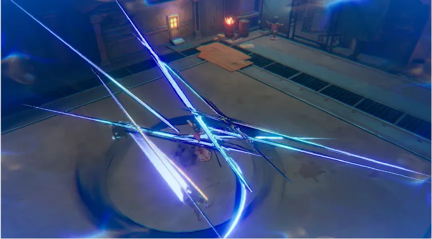 Quickly move through the enemy, dealing 1 instance of damage. Then quickly return to the starting position and recall blades from both sides. |