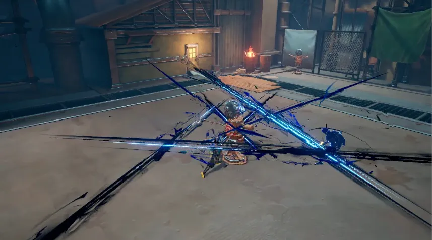 Performs a forward attack, gathering the enemies in an air current before shooting blades in a small area, dealing damage to enemies within the air current. |