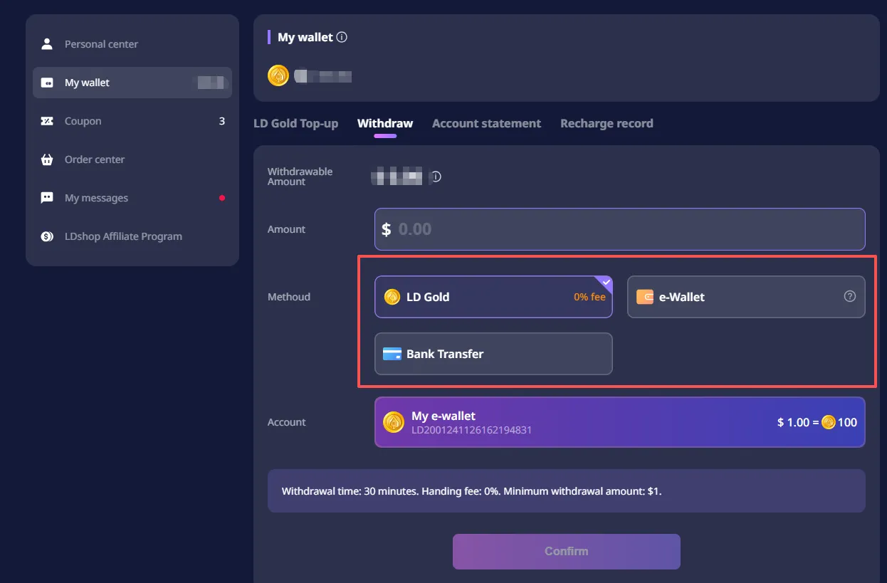 Your commission will show up in your Promotional Income. You can withdraw it as LD Gold (typically within 30 minutes) or withdraw cash (typically 3–7 business days).