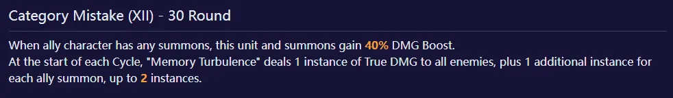 When this unit has summons, both it and its summons gain a 40% DMG boost. At the start of each cycle, it deals 1 plus the number of summons instances of True DMG to all enemies, up to 3 hits per cycle, with each hit hitting for around 70,000–90,000 damage—making it great for clearing enemy summons.