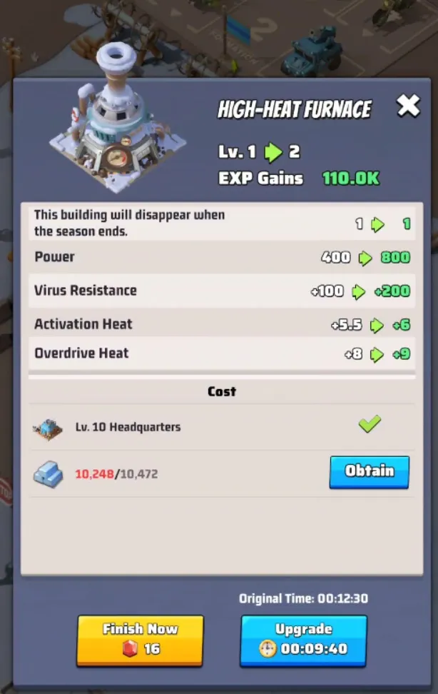 This is the most important building in Season 2. It burns coal to raise your base temperature and increase your Virus Resistance. Max level is 30, also independent of HQ level.