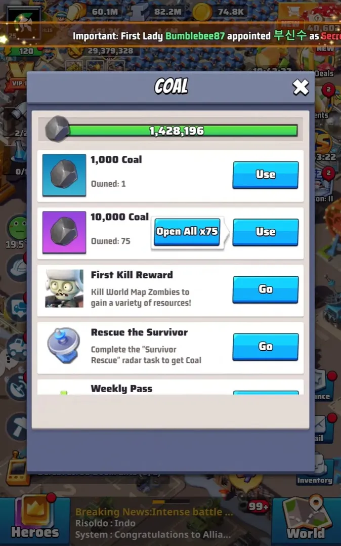 The free sources are hunting-based. Daily first kill rewards from Doomsday Wanderers, Arctic Zombies by level, and Doomsday Elite Troops all drop coal. Get into the habit of hunting every single day from the moment the season opens. First captures of cities and dig sites also reward coal and titanium alloy, so early map movement pays off doubly.