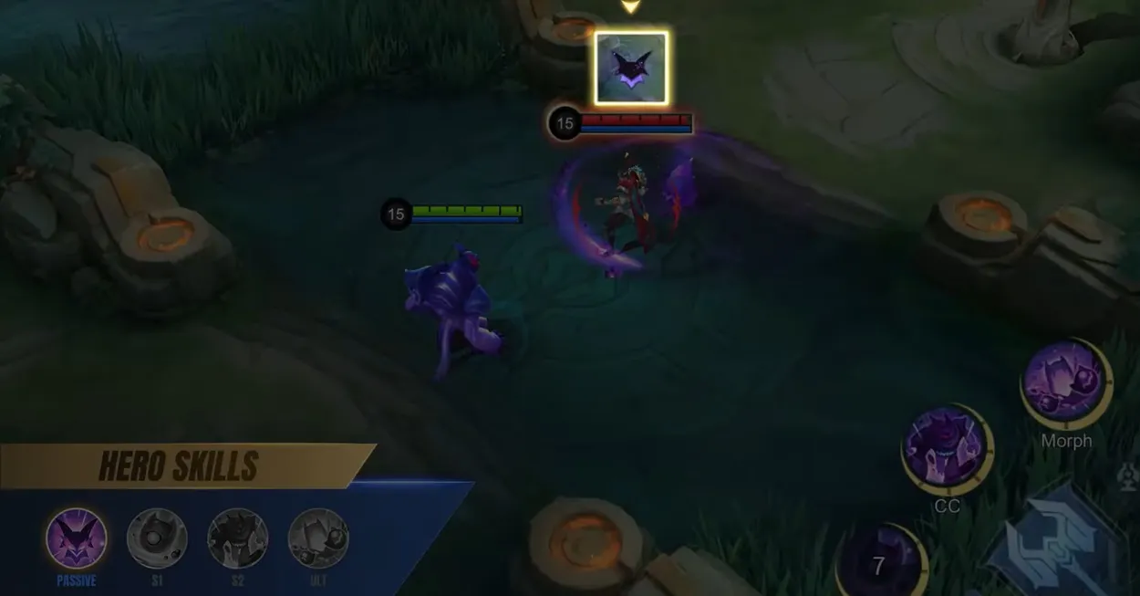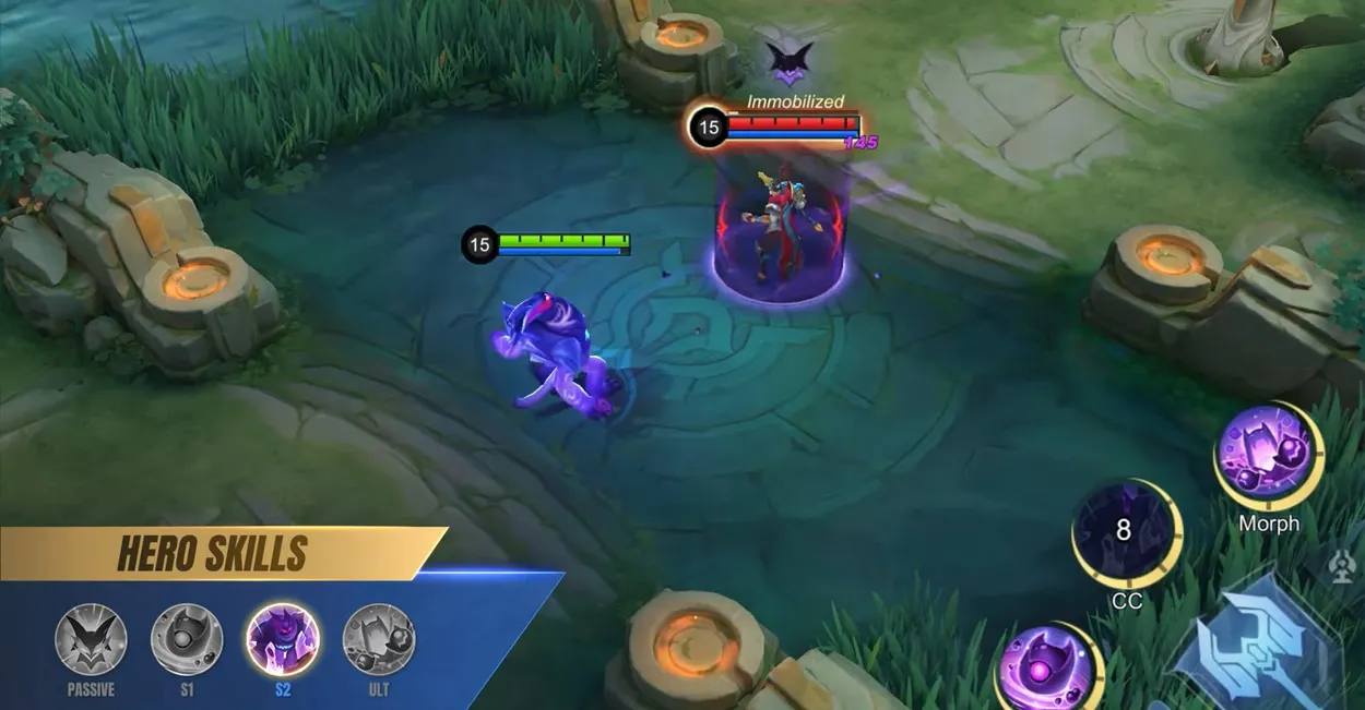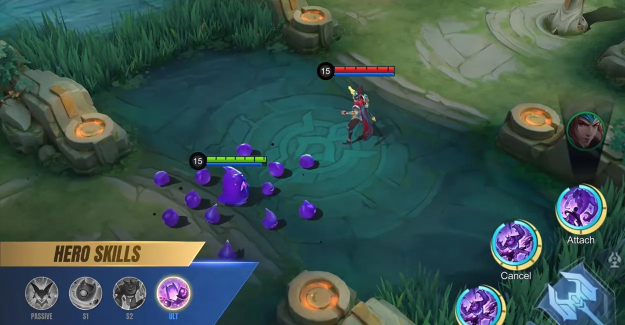 Gloo’s third skill or its Ultimate is an Attach type skill with a Healing effect. The Ultimate needs to be charged and cannot be used directly. When an enemy hero reaches the full stack of Sticky (passive), Gloo attaches itself to the target for a duration of 9 seconds. Using the ultimate will also restore 25-30% of Gloo’s MAX HP in an instant.
