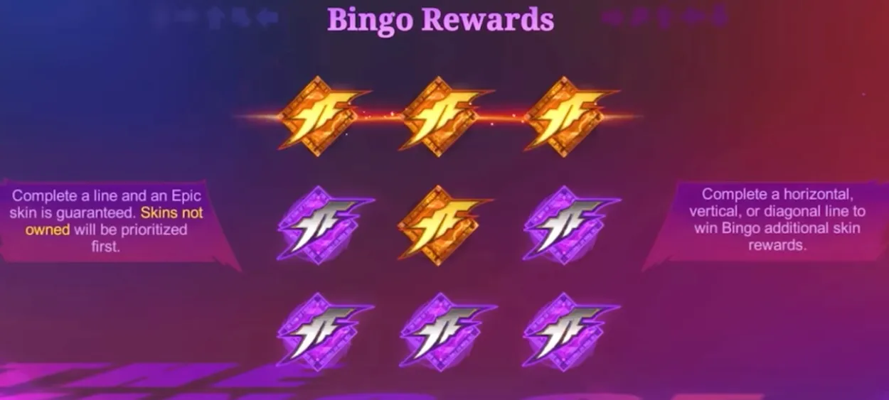 The event includes a bingo system, where you will need to light up three bingo pieces. Completing a line guarantees an Epic skin and skins not owned will be prioritised first. For every 10 draws, a random Bingo piece lights up on the Bingo board. Light up 3 Bingo pieces in a row, column, or diagonal to complete a Bingo line for an unowned KOF skin. If you already own all KOF skins, it will be replaced with an unowned Epic skin. You can get at most 1 skin by completing multiple Bingo lines at the same time.
