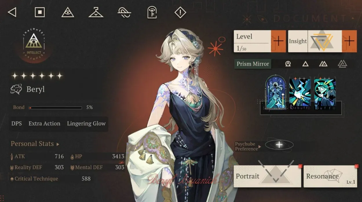 Beryl is a legendary diviner who runs a crystal workshop in Paris but unlike the typical fortune-teller, she can directly sense how your fate itself works which puts her in a completely different league. Beryl is one of the strongest Mental DPS characters due to her buff. She applies the Halo debuff to reduce enemy healing effects and to also inflict DOT while building Destined Doom nukes’ stacks. In a team, Beryl fits perfectly due to her versatile Emanation crystals.
