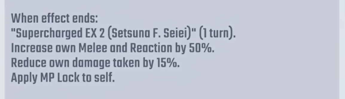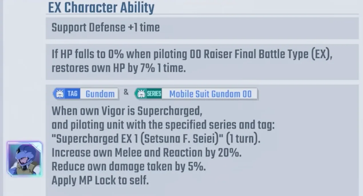 - When piloting a "Gundam" + "00" series unit and in Super Critical state, enters EX1 state (+20% Melee/Reaction, 5% damage reduction, MP Lock) for 1 turn, then EX2 state (+50% Melee/Reaction, 15% damage reduction, MP Lock) for 1 turn, after which MP decreases by 12.
