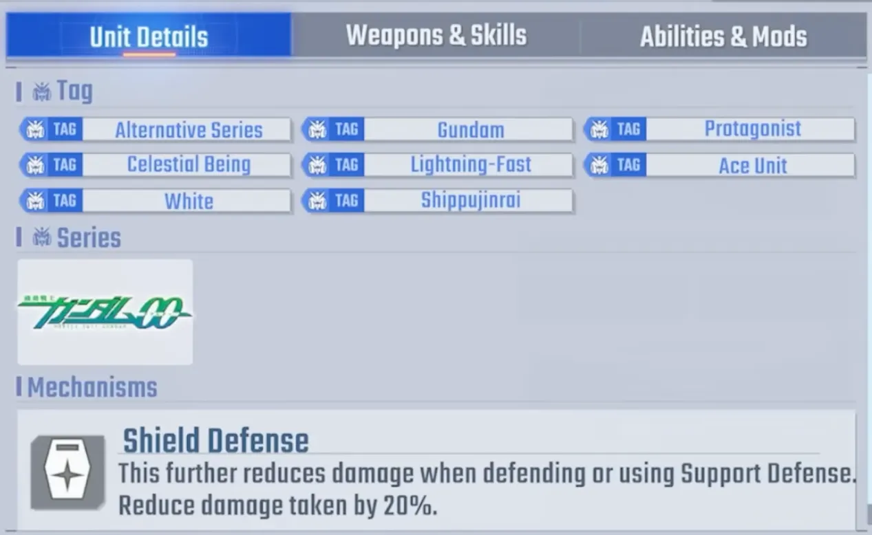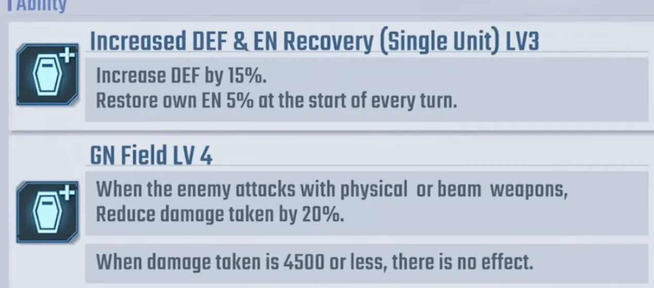 - Passive "GN Field LV4": Reduces damage from physical/beam attacks by 20%, nullifies damage 4,500 or less.