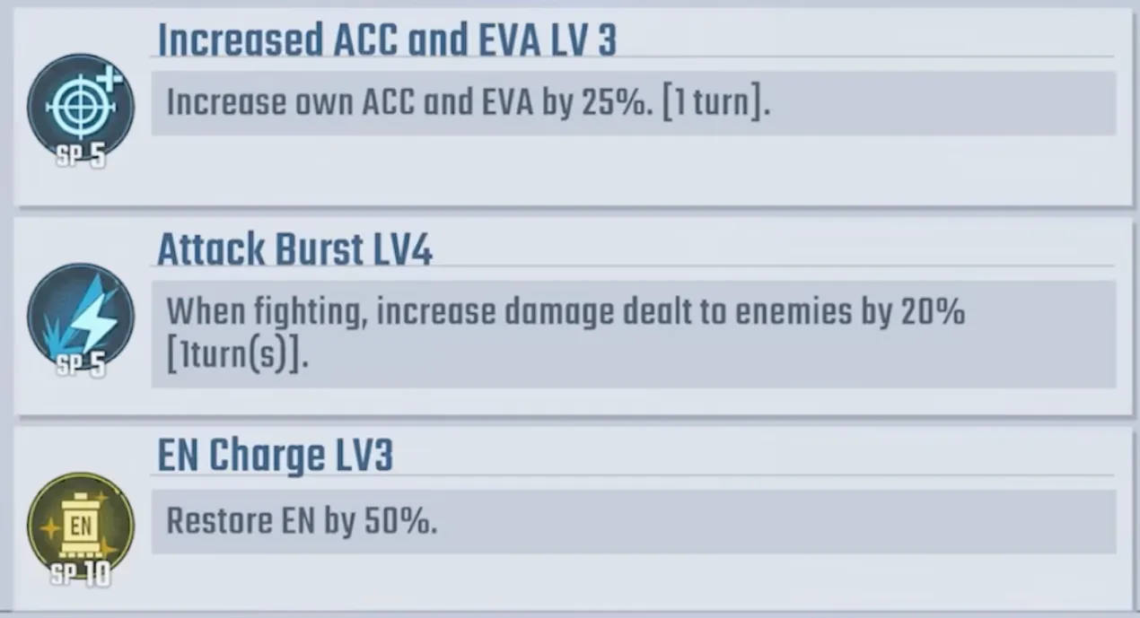 - Attack Burst LV4 (SP5): Damage dealt +20% (1 turn).