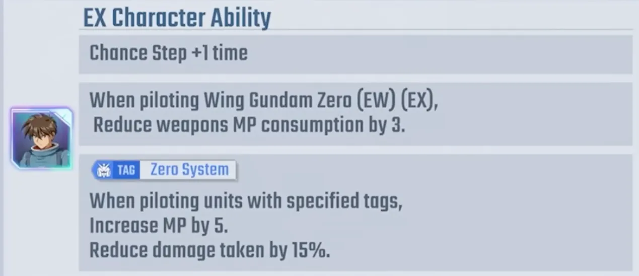 Heero's EX ability grants an "extra action +1 time" when piloting Wing Zero, as well as "Weapon MP Consumption -3". This means the EX weapon, which normally consumes 4 MP, costs only 1 MP, making it almost spammable. Furthermore, when piloting a unit with the "Zero System" tag, he gains +5 MP at battle start and 15% damage reduction. Combined with his active MP Up skill, Heero can easily reach Super Critical state in the first turn, offering exceptional smoothness in gameplay.