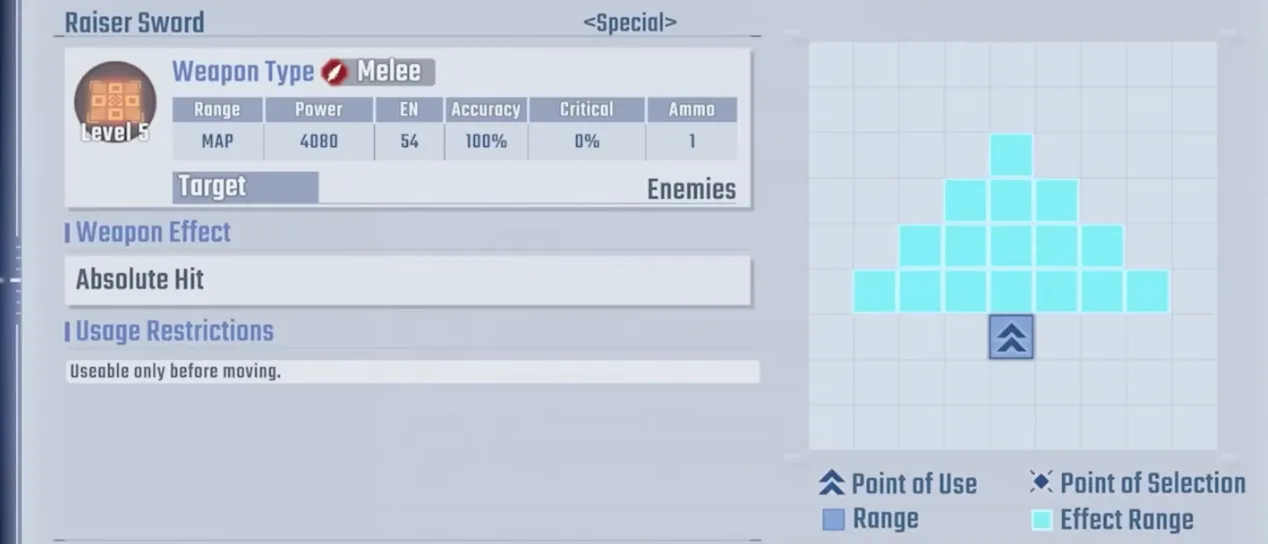 Its EX weapon "Raiser Sword EX": Range 1-4, Power 7,200, with Absolute Hit, ignores damage reduction, and inflicts a 35% ATK Down debuff for 1 turn. Its only drawback is the 4 MP consumption.
