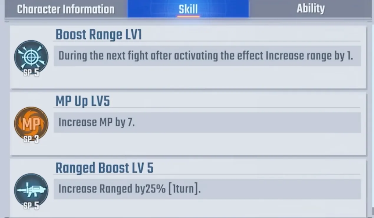 - Boost Range LV1 (SP5): +1 range in the next battle.