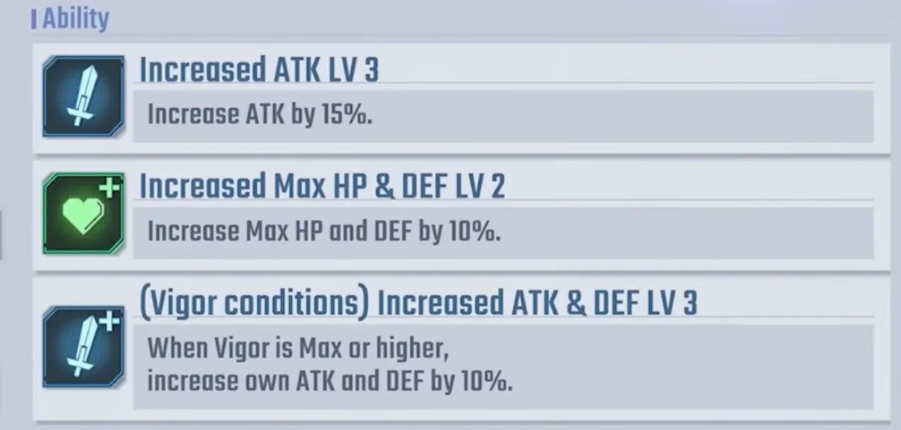 - Active Skill (once per battle): Increase ATK by 25% and DEF by 15% for one turn.