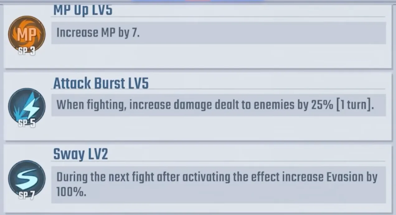 - MP Up LV5 (SP3): Self MP +7.
