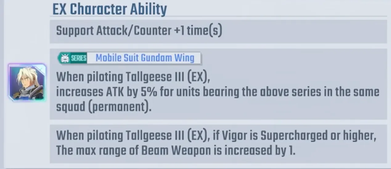 Tallgeese III's pilot, Preventer Wind, has a key EX ability: when piloting Tallgeese III and Vigor is Supercharged or higher, the max range of Beam Weapons is increased by 1. This means the EX weapon becomes 1-5 range, and the standard Mega Cannon becomes 3-6 range, greatly enhancing his support range.