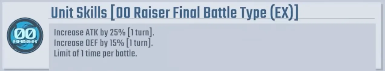 - When piloting 00 Raiser and HP reaches 0, revives once (restores 7% HP).