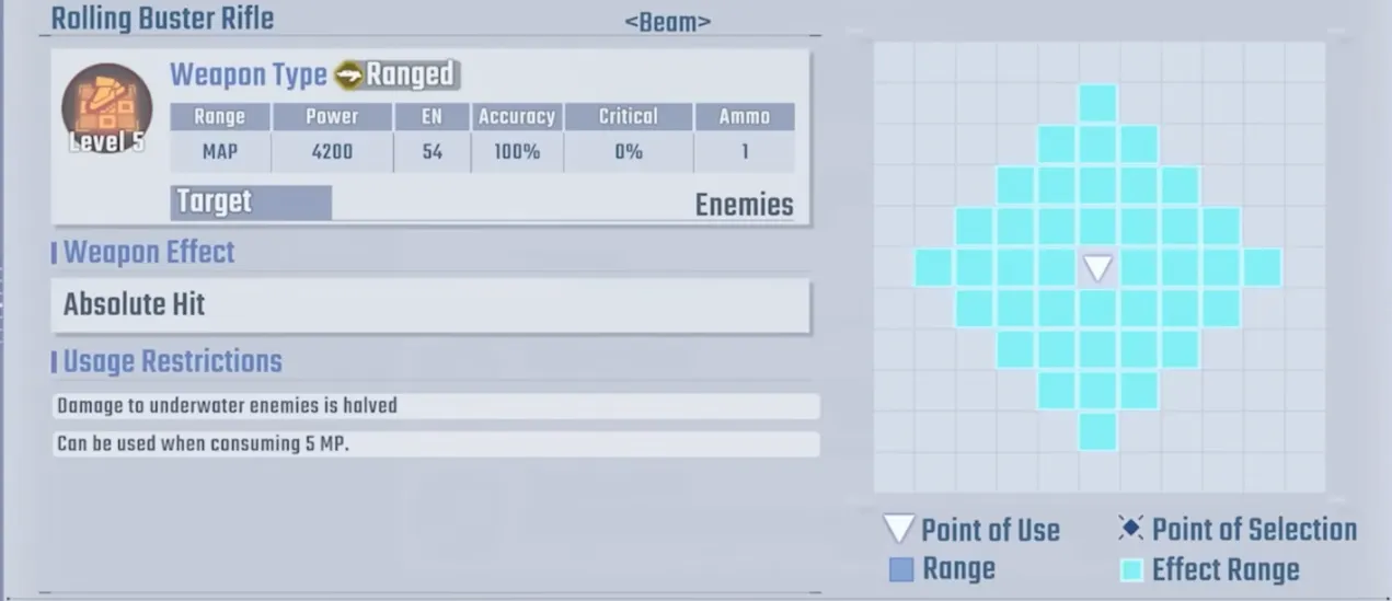 Wing Zero's biggest highlight is its MAP weapon "Rolling Buster Rifle": Power 4,200, fan-shaped area, usable after moving, consumes only 5 MP, with 1 ammo. It is currently the only limited unit in the game capable of "positioning → firing a map cannon" after moving, with farming efficiency far surpassing the Double X. In PVP Master League, while the AI may not perfectly utilize triple actions, its ability to use the post-move MAP to clean up low-HP enemies and bypass support defense makes it a difficult threat to handle.