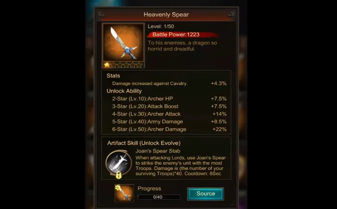 - Why: This is the absolute best artifact for Mage mains. The stat boosts are massive, but the Artifact Skill is the real killer: "When attacking Lords, use Magic Piercing Gunslinger to attack 6 enemy targets." This is a devastating heavy strike that decimates backline troops. If you run Mages, this is non-negotiable.