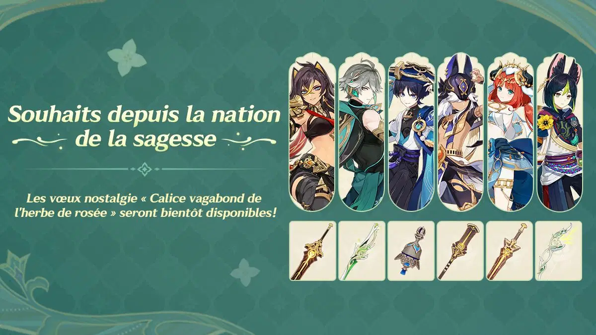 Voici les prédictions concernant les bannières de Genshin Impact pour les versions 6.4 à 6.7. Ces informations sont fournies à titre purement indicatif et ne sont pas garanties...! les détails définitifs devront être confirmés par les annonces officielles. L'auteur propose ici des spéculations pour alimenter la discussion et le divertissement de la communauté. Nous vous prions de nous excuser pour toute erreur qui aurait pu s'y glisser! Dès que les informations officielles sur les personnages et les bannières seront révélées, cette page sera mise à jour en priorité. Merci beaucoup pour votre compréhension!