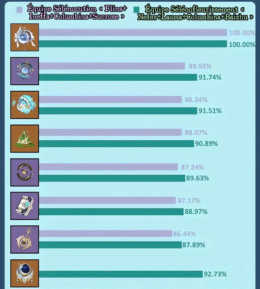 Pour tirer pleinement parti des effets de set des trois premiers artéfacts listés sous « Sous-DPS en arrière-plan » (Nuit de la Filature Lunaire, Aubade de l'Étoile du Matin et de la Lune, Nuit de la Manifestation du Dôme), il est impératif que votre équipe ait atteint le niveau lunaire « Pleine Lumière » (满辉, Pleine Lumière) . La composition de l'équipe doit être soigneusement planifiée autour de cette condition pour maximiser les dégâts des réactions lunaires. Les sets « Tenacité du Millelite » et « Souvenirs de la Forêt Profonde » ne sont pas soumis à cette restriction.