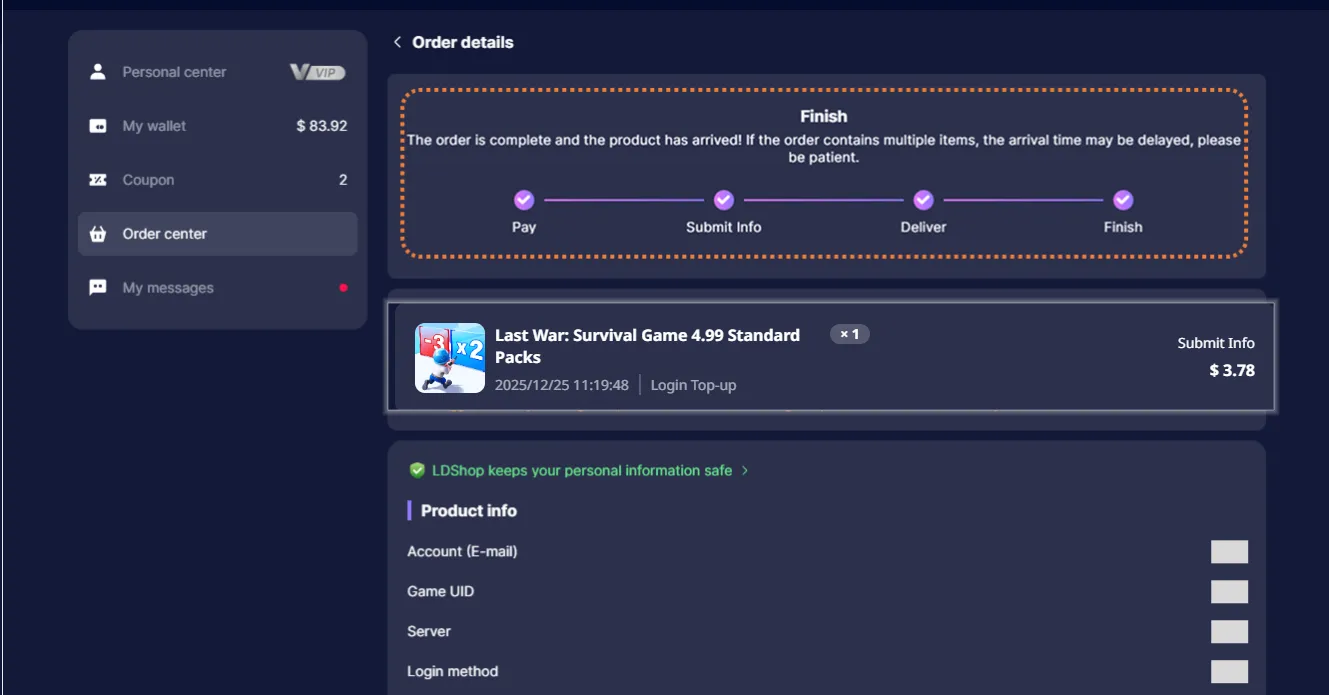 - Track your top-up status in the Order Center. Once the top-up is complete, you can verify it in the game.