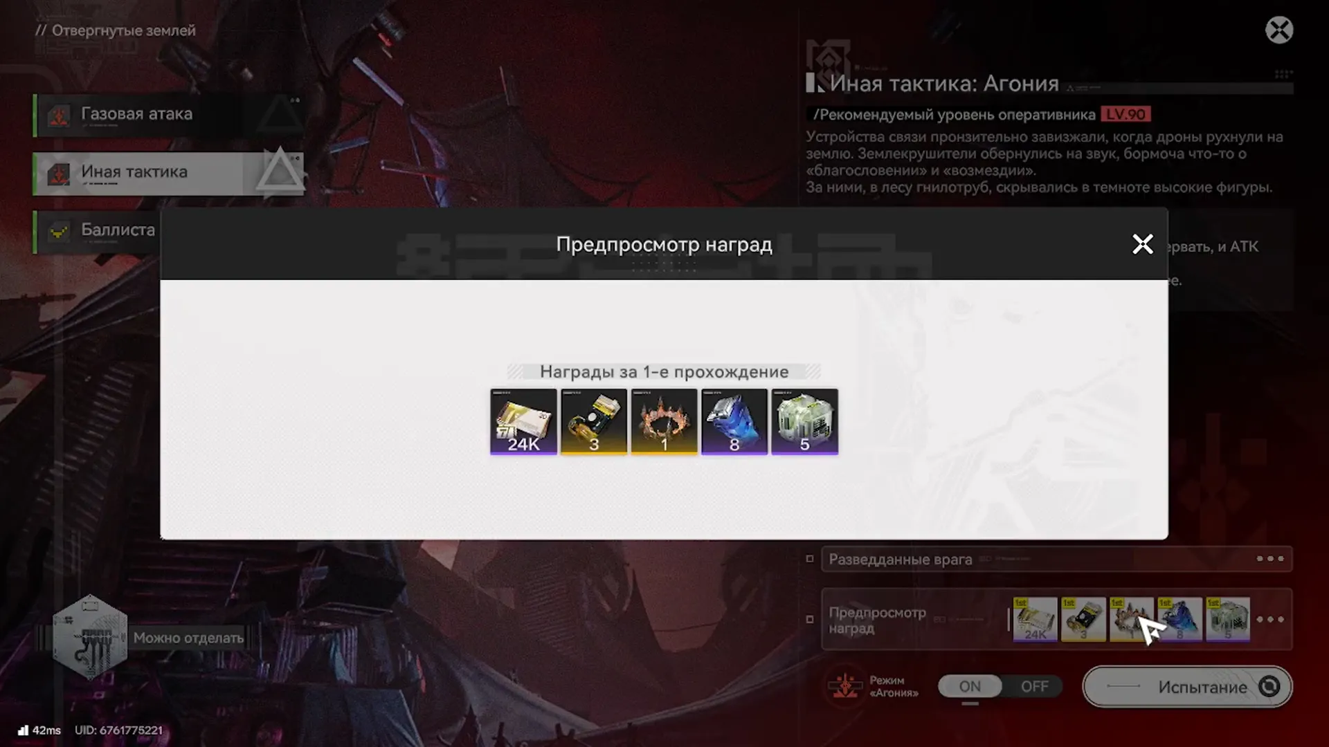 - Ресурсы: Помимо этого, за первое прохождение всех этапов полагаются разовые награды, среди которых: Mark of Perseverance (Знак настойчивости), Advanced Cognitive Carrier, комплект Arms INSP и Protohedron.