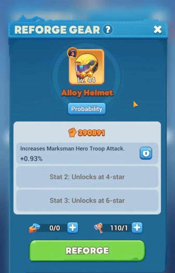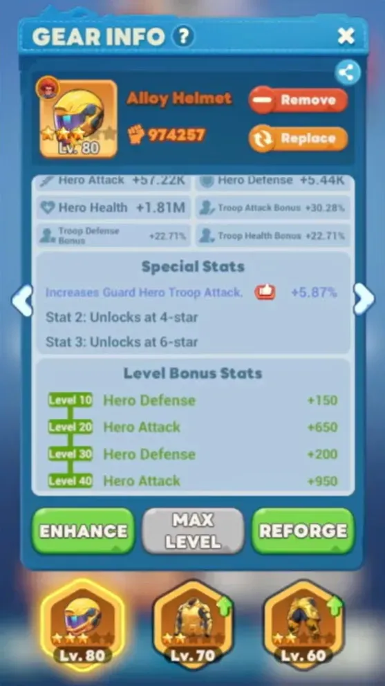 1. Снаряжение героя (Hero Gear): Это базовый уровень экипировки. В данную категорию входят такие предметы, как шлемы, жилеты и т. д. У каждого героя есть 3 слота, и каждый предмет в них увеличивает ключевые показатели персонажа: атаку, защиту и здоровье.