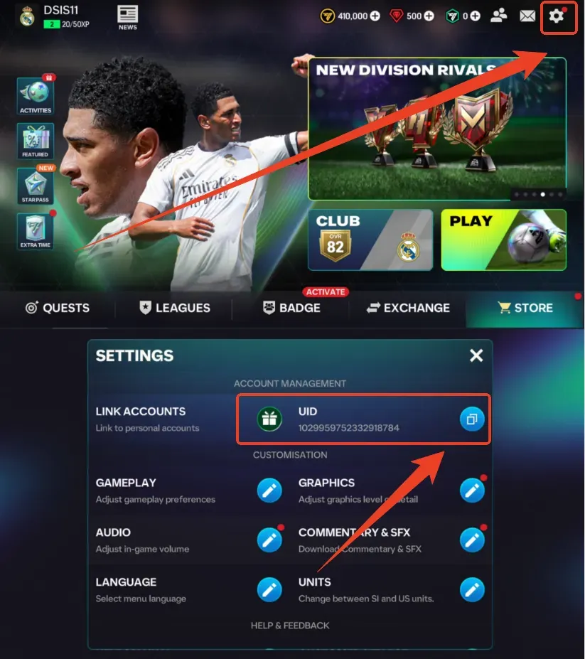 • Игровой UID: ID вашего аккаунта EA SPORTS FC™ Mobile Soccer