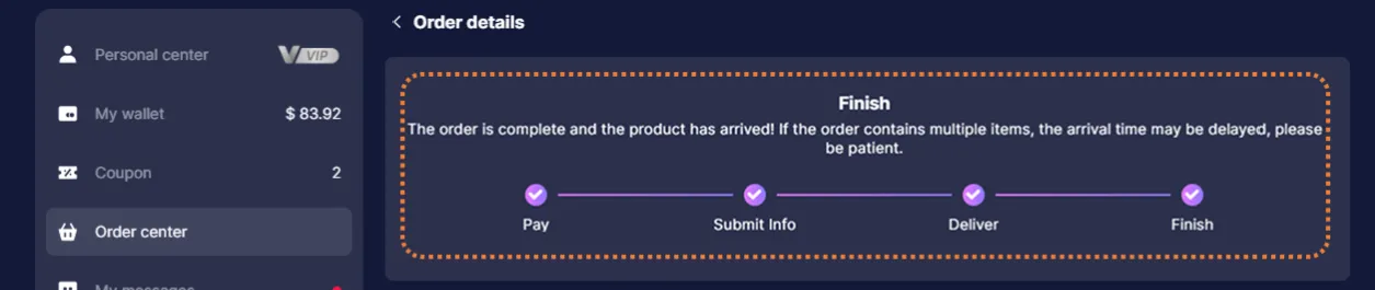 5. Track your top-up status in the Order Center. Once the top-up is complete, you can verify it in the game.