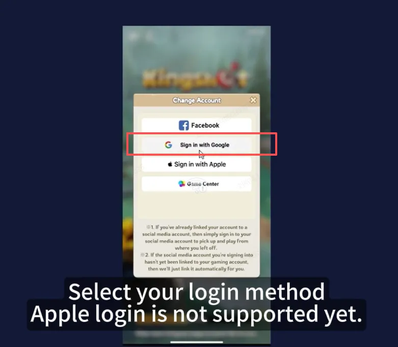 Log in to the game -> Click the "Gear Icon" on the upper right corner -> Select "Account" -> Link your game account with Google/Facebook.