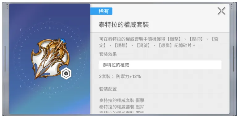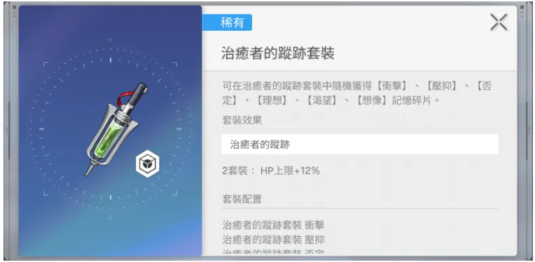 2件套:防禦效果套裝(泰特拉的權威套裝)和治療效果套裝(治癒者的蹤跡套裝)