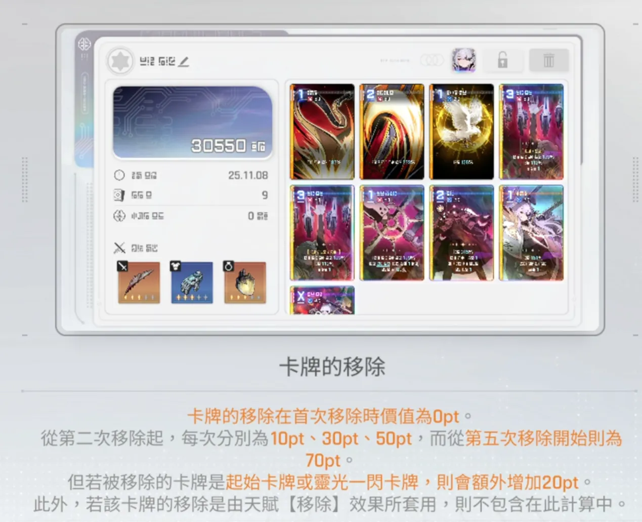 注意: 起始卡和靈光一閃卡移除額外+20PT,但是天賦的移除不計算在內。