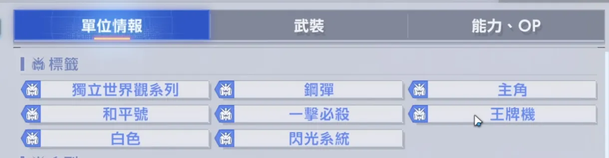 - 頂尖的標籤:標籤同時涵蓋“一擊必殺”和“王牌機”兩大頂級輸出詞條,且擁有“主角”、“閃光系統”等,適配性極廣,能輕鬆融入當前主流的高傷害編隊。