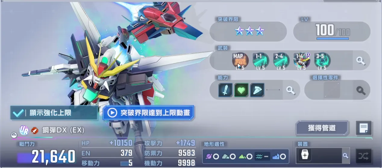 - 補強王牌/一擊必殺詞條:你的隊伍核心是攻擊自由或神鋼彈,需要強力的同詞僚機。鋼彈DX優秀的五射程可以很好地擔任副C。