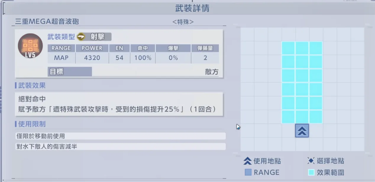 - 優質的地圖兵器:MAP武器“三重MEGA超音波砲”範圍為 3x6,附帶”特殊傷害提升25%”的debuff效果。雖然威力(4320)作為支援機中規中矩,但範圍和特效優秀,兼顧了清兵與輔助。