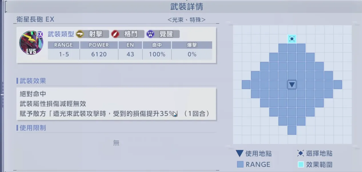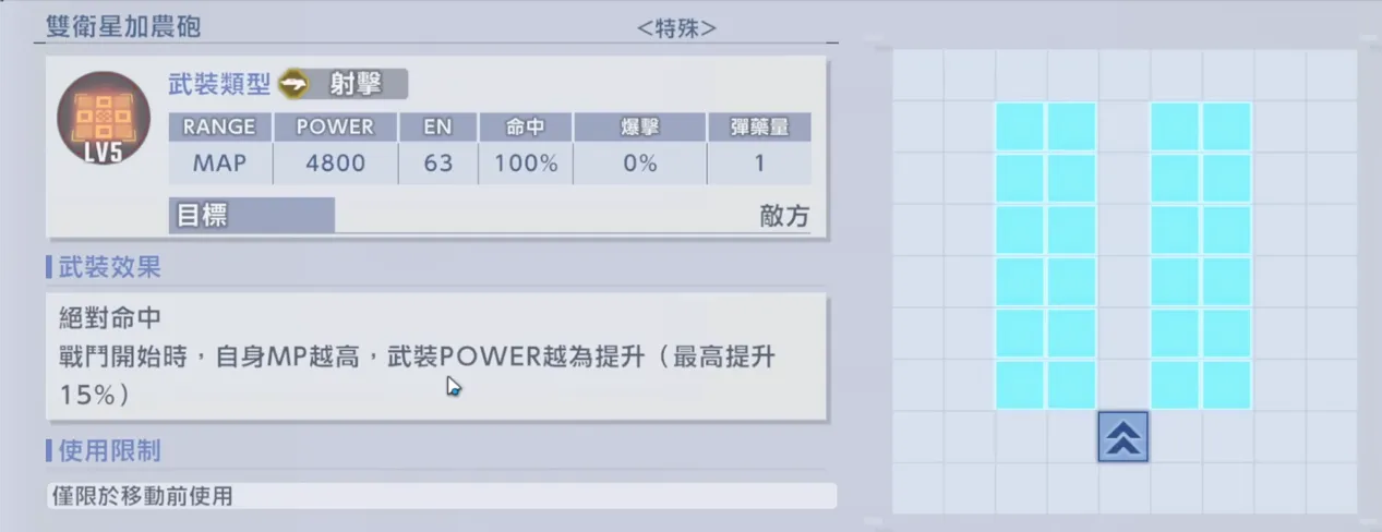 - 頂級的清場能力:其MAP武器“雙衛星加農砲”範圍達到獨特的 2x6 直線,比常規的3x5更廣。4800的基礎威力在”MP越高威力越高”(最高15%)的效果加持下,超一擊時可達5520,清雜效率所有攻擊型機體中傲視群雄。
